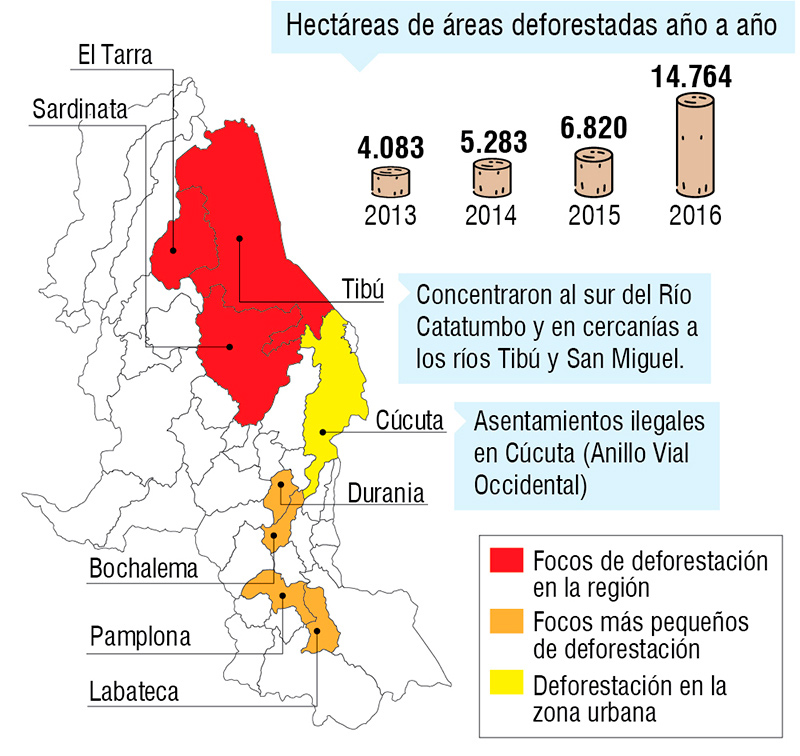 Los indicadores son dramáticos, dijo Sandra Gómez, directora de Recursos Naturales de la Corporación Autónoma Regional de la Frontera Nororiental (Corponor), pues en solo un año se triplicó la deforestación, al parecer, por el aumento de los cultivos ilícitos en las zonas de conflicto armado, la tala ilegal y la ampliación de la frontera agrícola.