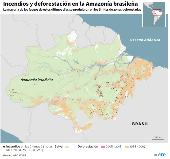 Este año ya se produjeron más de 80.000 incendios en Brasil (un alza de casi 80% respecto a 2018). Más de la mitad de los focos (52%) se registraron en la región amazónica.