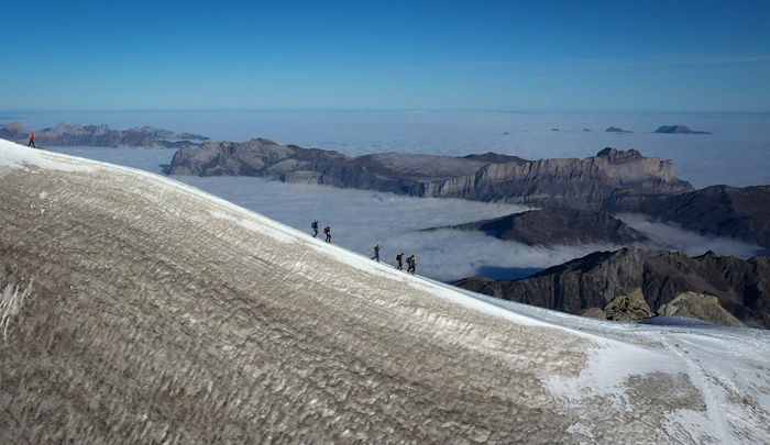 Desde un helicóptero durante un vuelo sobre el macizo del Mont Blanc, el investigador reprodujo con exactitud tres fotografías realizadas en 1919 por Walter Mittelholzer, piloto y fotógrafo suizo, cofundador de Swissair. El Mar de Hielo, el glaciar de los Bossons y el de Argentiere.