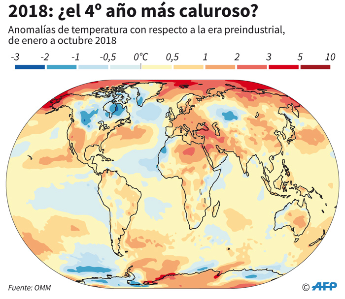 En su declaración provisional sobre el estado global del clima, la Organización Meteorológica Mundial (OMM) observa que la temperatura media de la superficie del planeta en los 10 primeros meses del año fue superior en casi 1 ºC a los valores de la época preindustrial (1850-1900), por lo que "2018 se anuncia como el cuarto más cálido jamás registrado".