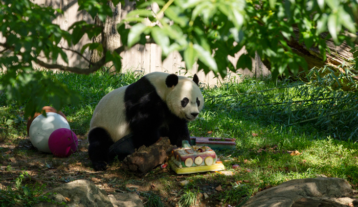 Para su cuarto cumpleaños el plantígrado blanco y negro degustó un pastel congelado rojo, amarillo y azul adaptado a su alimentación, como parte de una celebración que fue transmitida mediante el sistema "Panda Cam" que graba en directo su habitáculo.