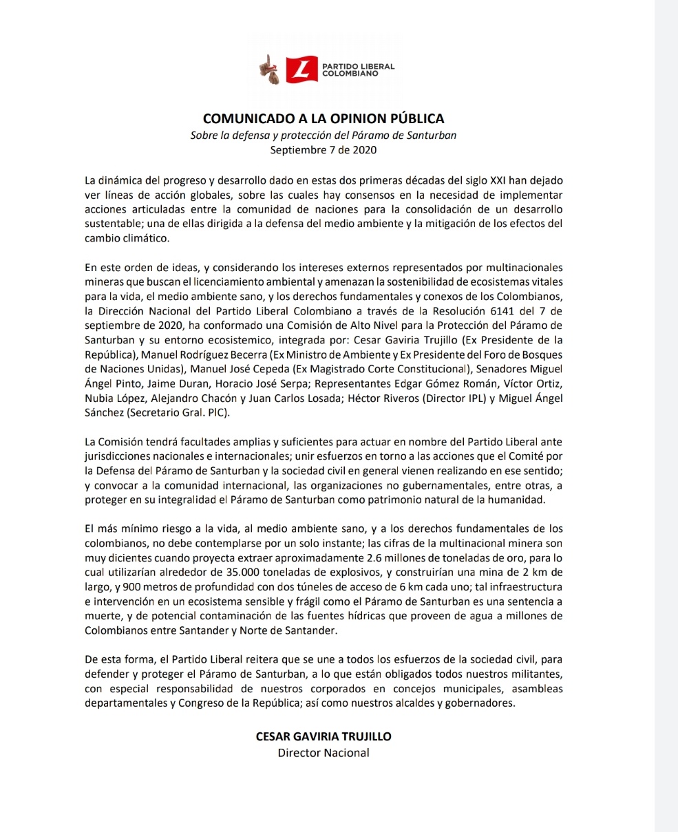 “No vamos a permitir que en páramos y reservas naturales se practique la minería, El Partido Liberal hizo aprobar hace varios años la ley de protección de páramos para evitar que se sigan llevando el agua y minerales de nuestros reservas naturales, en esta ocasión vamos a proceder jurídicamente para oponernos a esta explotación”, señaló el expresidente César Gaviria.