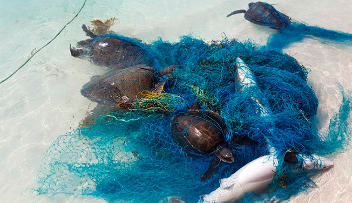 Lo mismo ocurre con las especies que viven en el suelo marino, a causa de equipos de pesca como las redes, que se hunden hasta el fondo del mar llenas de pescados, lo que atrae a predadores que terminan quedando enredados.