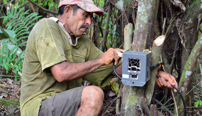 Rolando Méndez, agricultor, instala cámaras trampa en el área de estudio. Foto: Maria Fernanda Puerto.