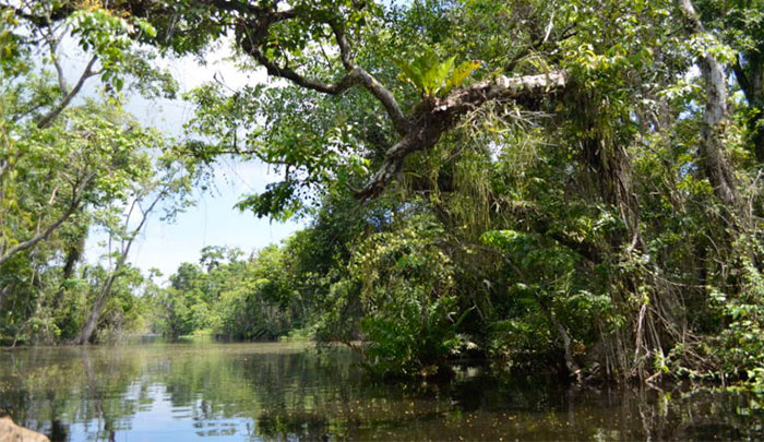 Recorridos en bote o curiara por el bosque de pantano para la revisión de cámaras trampas. Foto: Martin Dávila.